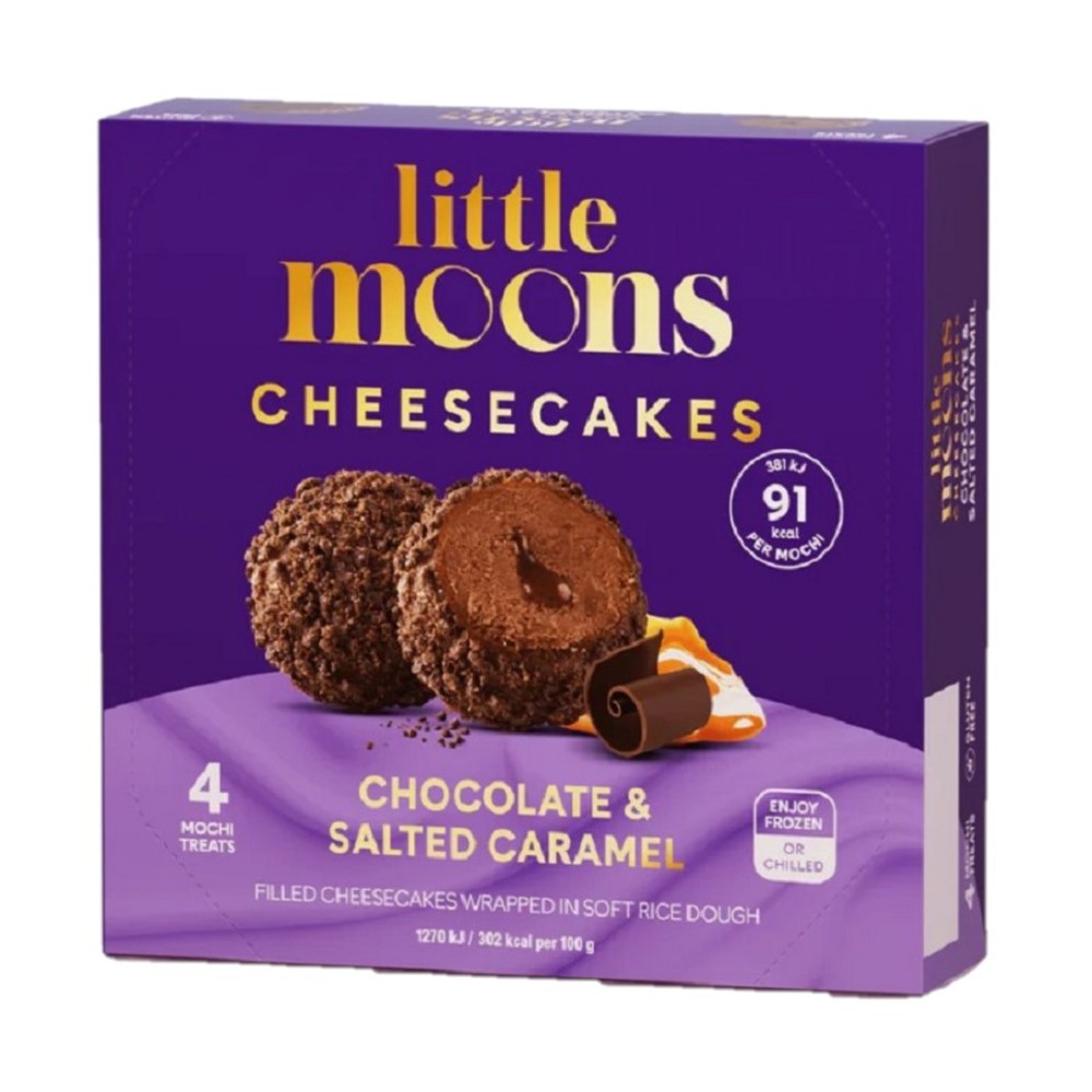 Little Moons Chocolate Salted Caramel Cheesecake Mochi is a delicious and luxurious ice cream experience, where creamy cheesecake ice cream with an intense chocolate flavor meets a soft core of salted caramel. Everything is wrapped in a soft, chewy mochi dough and sprinkled with gluten-free cookie crumbs, which provide a nice contrast in texture. Perfect as a small dessert or a sweet snack that indulges the taste buds. This pack contains 4 pieces of 30 grams each and is both gluten-free and suitable for vegetarians.