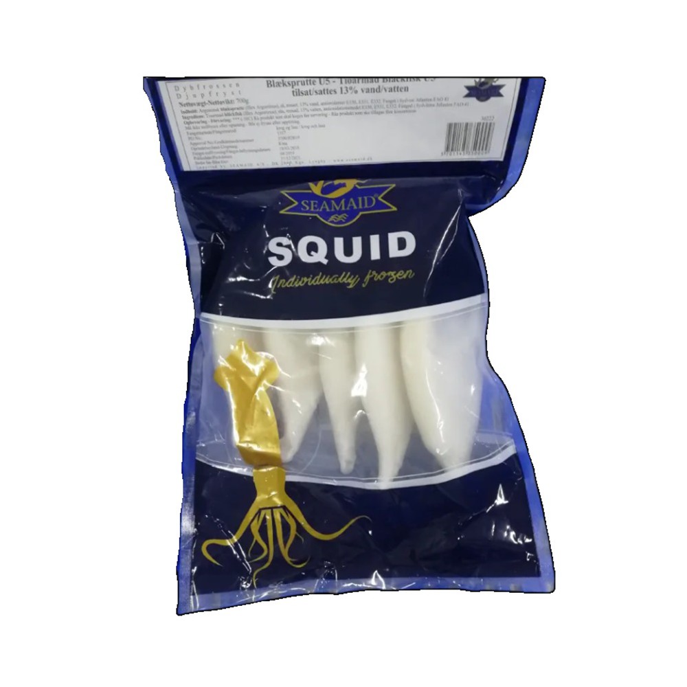 Ingredienser: Argentinsk BLÆKSPRUTTE (Illex Argentinus) 87%, rå, renset, vand,antioxidanter: E330, E331, Fanget i Sydvest Atlanten FAO41.
