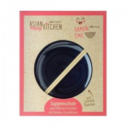The set consists of a soup bowl and a spoon made of porcelain, and a pair of bamboo chopsticks.