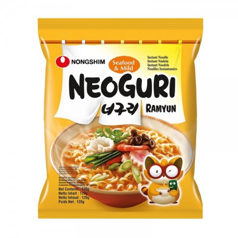 Neoguri is Nongshim's brand dedicated exclusively to clean, deep soups and al dente noodles characterized by pieces of Korean seaweed. This noodle type is an "udon"-style ramyun.