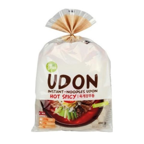 Allgroo Udon Noodles Hot & Spicy is an instant noodle soup from South Korea that offers an authentic and spicy taste experience. This variant contains thick, soft udon noodles as well as a flavor blend of chili, garlic, onion and spices, giving a warm and spicy soup. Dried flakes of spring onion, pak choi, red pepper, carrots and onion add extra texture and flavor to the dish.