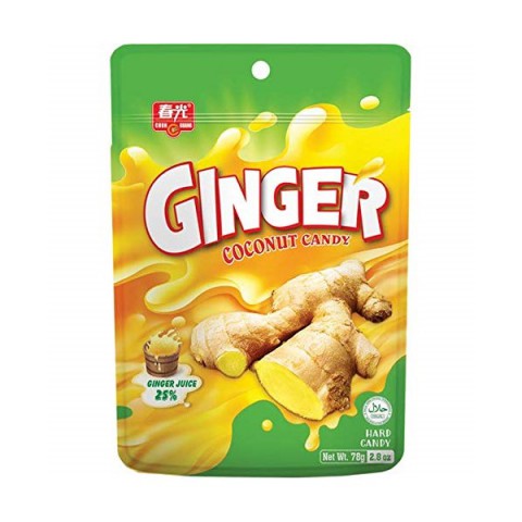 Ginger Coconut Candies 78g Chun Guang offers an exciting combination of spicy ginger and sweet coconut. The flavor begins with a gentle spicy warmth from the ginger, which gradually blends with the round and creamy sweetness of the coconut. This unique flavor fusion creates a balanced and refreshing experience, where the warming ginger gives a kick while the coconut's sweetness softens and rounds off the taste. Ideal as an exotic and flavorful snack that brings both spice and sweetness to the palate.