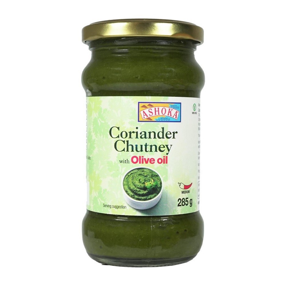 Ashoka Coriander Chutney with Olive Oil (285 g) is a fresh and spicy sauce, ideal as a dip, spread or flavor enhancer in your dishes. It is made from 76% fresh coriander, with a zesty base of lime, green chili and a subtle oil note. Sweetness from roasted chickpeas and warm spices rounds off the flavor – perfect for samosas, wraps, grilled meats or vegetarian dishes. Vegan, medium-spicy and authentic – a versatile product for the kitchen.
