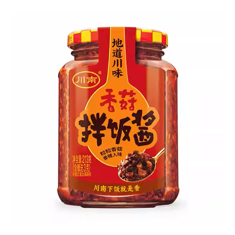 Ingredienser: rapsolie 52,8%,champignon 25,8%, chili 9%, SOJAsauce 5%, salt, mononatriumglutamat,, gærekstrakt, ingefær, hvidløg, forårsløg, sukker, krydderi, shichuan peber.