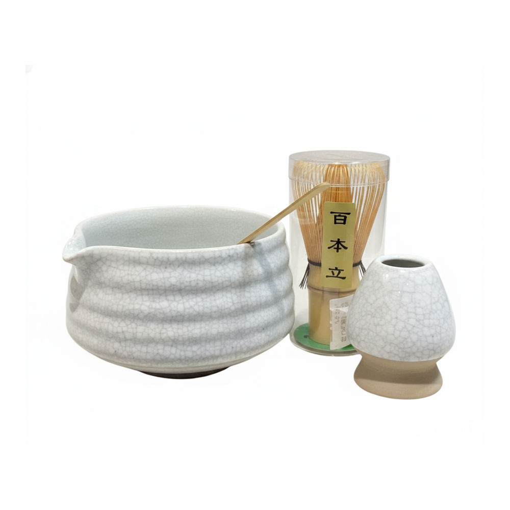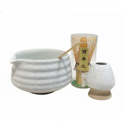 Matcha te-sæt bestående af 1 skål, 1 ske, 1 matcha-piskeris og 1 piskerisholder.