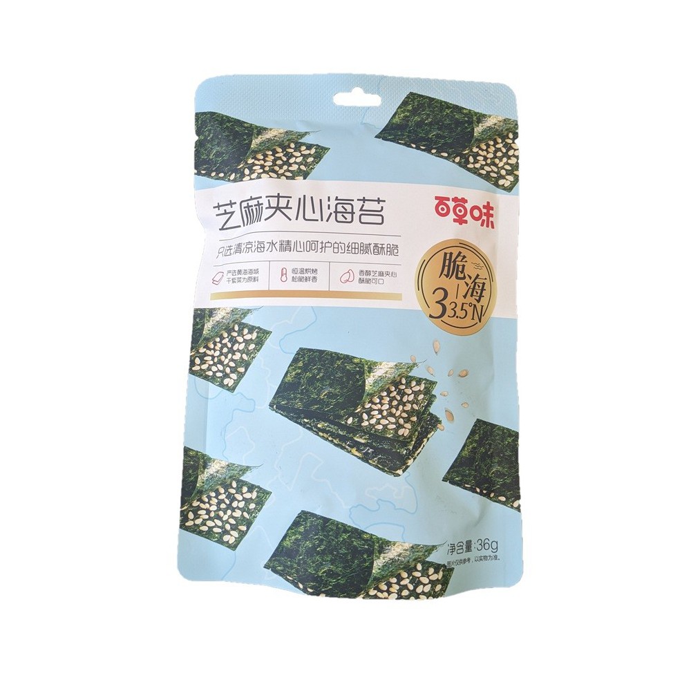 Tangsnack m. Hvide Sesamfrø 36g Bai Cao Wei er en sprød og lækker snack, der kombinerer den naturlige umami-smag fra tang med den rige, nøddeagtige aroma fra ristede hvide sesamfrø. Hver pakke indeholder tynde, let sprøde tangstykker med en fyldig sesamsmag, hvilket giver en harmonisk balance mellem salt, let sødme og nøddeagtige noter.