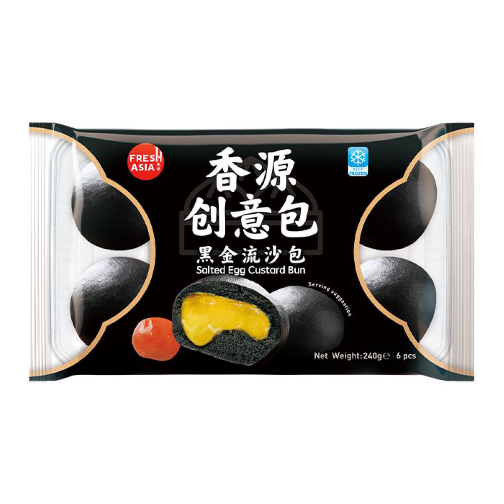 FRESHASIA 的黑色咸蛋奶黄蒸包是经典流沙包 (流沙包) 的现代演绎——一种内馅流动如“岩浆”的包子,兼具奢华与正宗风味。