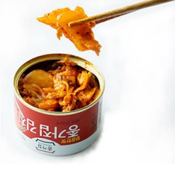 Jongga 品牌的罐装 Mat Kimchi 体积紧凑,易于存放。它已切成小块,随开随食,方便随处享用。这样无论身处何地,都可以随时享用新鲜泡菜,而不会牺牲风味。