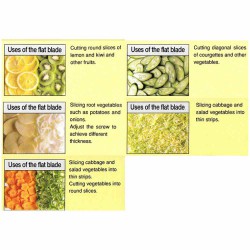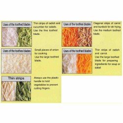 高品质切割: 采用高质量不锈钢刀片,材质与日本厨刀相同。配备三种刀片以实现不同切割:细丝、斜切丝、小块. 平刀片可根据需要随时磨锋。