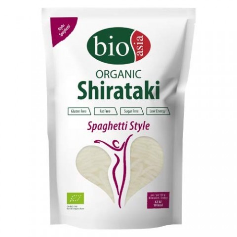 有机白滝(Shirataki)面条,由低热量魔芋粉制成,呈意大利面条形状。